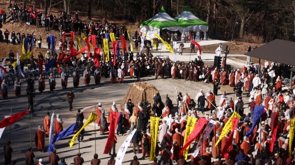 김천 직지사 연화대에 영허당 녹원 대종사의 법구가 도착 사부대중들이 지켜보는 가운데 다비식이 봉행됐다.“불법승”, “(스님)불 들어 갑니다”란 애타는 외침 속에 거화된 연화대는 불길에 휩싸였다.직지사 주지 웅산스님과 문도들은 불 지킴이를 자처하며, 녹원 대종사의 가는 길을 지켰다.김도은기자