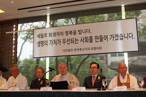 한국종교지도자협의회(종지협)는 12일 서울 소공동 웨스틴 조선호텔에서 기자회견을 열고 세월호 참사와 관련 "생명의 가치를 우선하는 사회를 만들어 가겠다."면서 깊은 탄식과 함께 희..