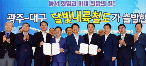 달빛내륙철도(광주~대구) 조기 건설을 위해 영·호남 9개 지방자치단체가 힘을 모은다.18일 광주시에 따르면 달빛내륙철도가 통과하게 될 9개 지자체가 18일 오후 2시 국회 의원회관에..