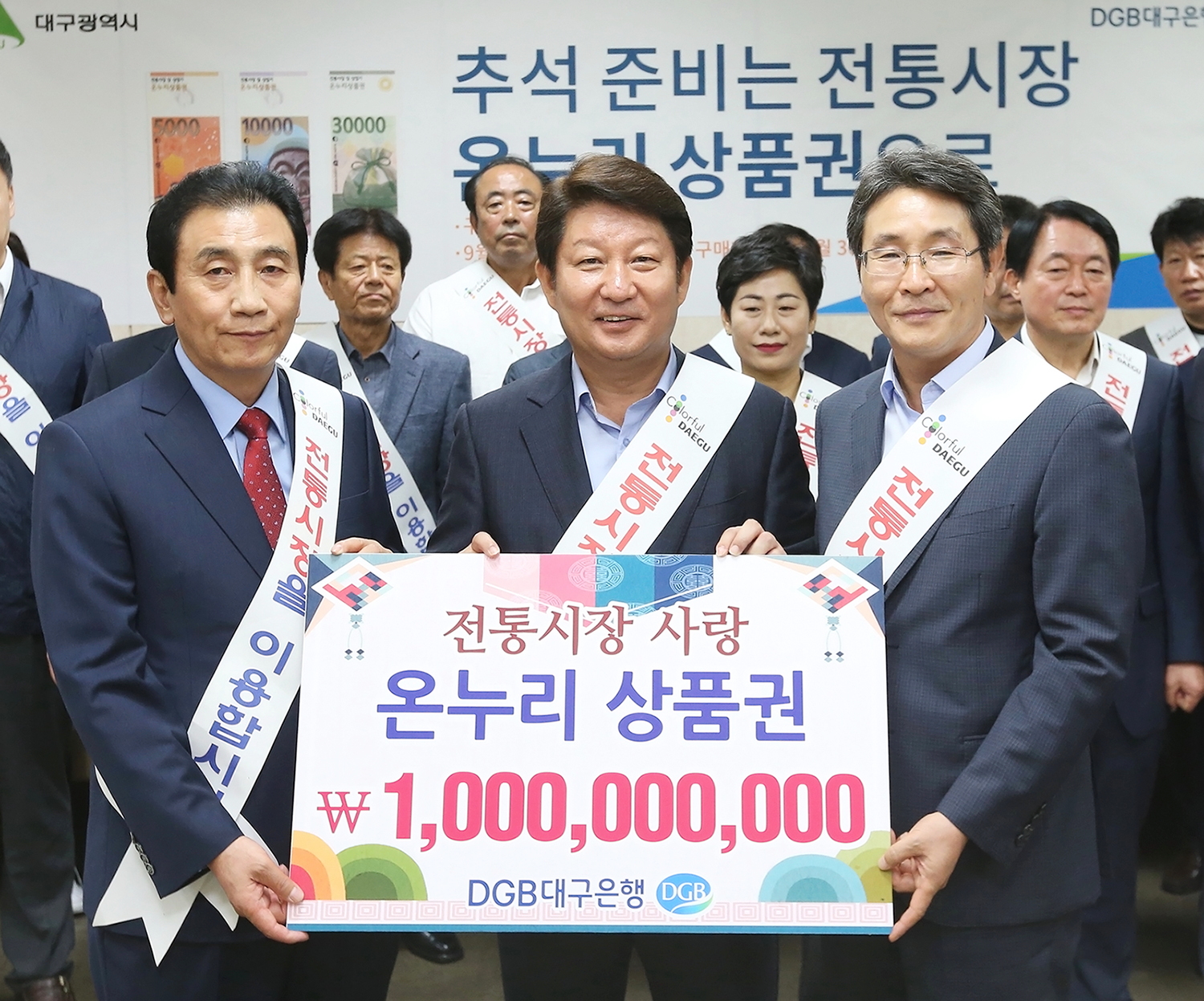 DGB금융그룹은 추석을 앞두고 19일 대구은행 시청영업부에서 진행된 ‘추석맞이 온누리상품권 판매행사’에서 10억 원 상당의 상품권 구입을 약정했다고 밝혔다. DGB금융그룹이 구매..