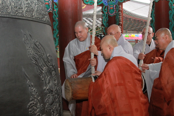세월호 참사 1주기를 맞아 총무원장 자승스님이 조계사 종각에서 조계사 주지 원명스님과 원내 부실장스님과 세월호 참사 1주기 추모 타종을 했다. ▲ © 편집부 한편 16일(목) 조계사를 비롯한 전국 본말사에서는 세월호 희생자들의 극락왕생을 기원하고 유가족의 아픔을 치유하는 타종을 오전10시에 일제히 봉행했다.