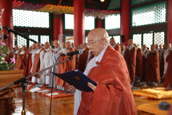 수행력과 덕망을 겸비한 원로 스님들께 종단 최고 법계인 대종사 법계를 품서하는 품서식이 지난 7일(화) 오전10시40분 동화사 통일기원대전에서 열렸다. 종정예하 진제스님은 이 자리에서 세민, 정련, 지성, 대원, 성파, 성우스님 등 6명의 현직 원로의원 스님들에게 대종사 법계를 품서했다. 이날 대종사 법계 품서식은 고불문 낭독을 시작으로 헌화, 법계증 및 가사수여, 청법게, 종정예하 법어, 발원문, 불자봉정, 사홍서원, 기념촬영 순으로 진행됐다. 종정예하는 대종사 법계를 품수한 스님들에게 대종사 법계증과 대종사 휘장이 부착된 25조 가사를 내리며 끊임없는 정진을 당부했으며, 총무원장 자승스님은 ‘불자(拂子)’를 봉정하며 대종사 품수를 축하했다 |